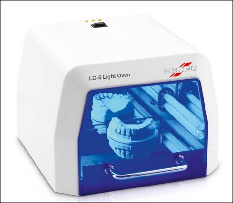 LC 6 Light Oven High-capacity light polymerisation unit for up to 4 models and fixator. Its inner dimensions of 170 x 160 x 120 mm (W x D x H) offer enough space for articulated and mounted models. Six fluorescent light tubes (3 UVA and 3 blue light tubes) and an aluminium reflector guarantee homogeneous illumination. Two polymerisation times of 5 and 10 minutes are already pre-set in accordance with the light-curing DURASPLINT LC material. Continuous operation can also be set. Spectral range of the light curing device between 350 and 450 nm. Auto start function for easier application.