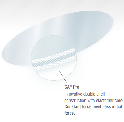 CA Pro The powerful thermoforming material with flexible elastomer layer. More endurance, less pressure: CA Pro is setting new standards in aligner treatment. A flexible elastomer core in a hard-elastic double shell ensures a continuous power level at a reduced initial force and higher patient comfort. CA Pro can be used as independent aligner material or within the 3-splint-system of the CA protocol. high elasticity and break resistance thanks to a flexible elastomer layer continuous force transmission, minimal loss of power high wearing comfort thanks to gentle initial force also available: CA Pro with integrated insulation foil