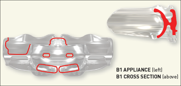 MYOBRACE B1 - HABIT CORRECTION - The B1 provides habit correction. It features a braces channel, tongue tag, tongue guard, elevators, extended lip bumpers and high sides to correct tongue position, discourage overactive lip function and encourage nasal breathing in conjunction with fixed braces treatment.