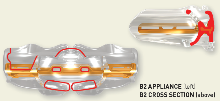MYOBRACE B2 - ARCH EXPANSION - MYOBRACE B2 The B2 provides arch expansion. It features a braces channel, DynamicoreT, tongue tag, tongue guard, elevators, extended lip bumpers and high sides to assist with arch development, correct tongue position, discourage overactive lip function and encourage nasal breathing in conjunction with fixed braces treatment.